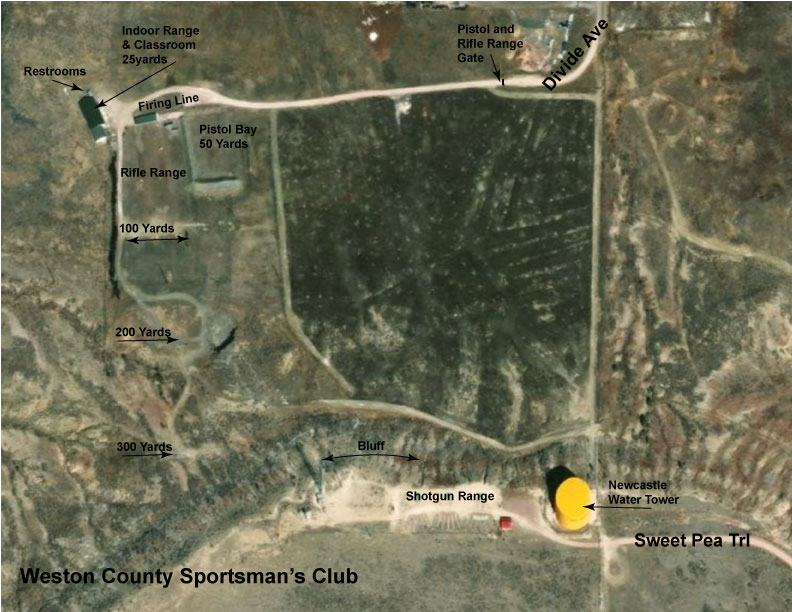 The range is located on the outskirts of Newcastle just below the landmark water tower. Look for the large red/orange tank with the black Dogie (pronounced Doe-gee) mascot painted on it. Access to the rifle range and indoor range is from the Highway 16 bypass. Turn south on Rodeo Street off the west end of the bypass as it goes over the railroad tracks. Then turn left (east) on Sheridan Street. Take it to the end, then turn right (south) on Divide Ave. Follow it around until you get to the gated entrance shown on the Home page.